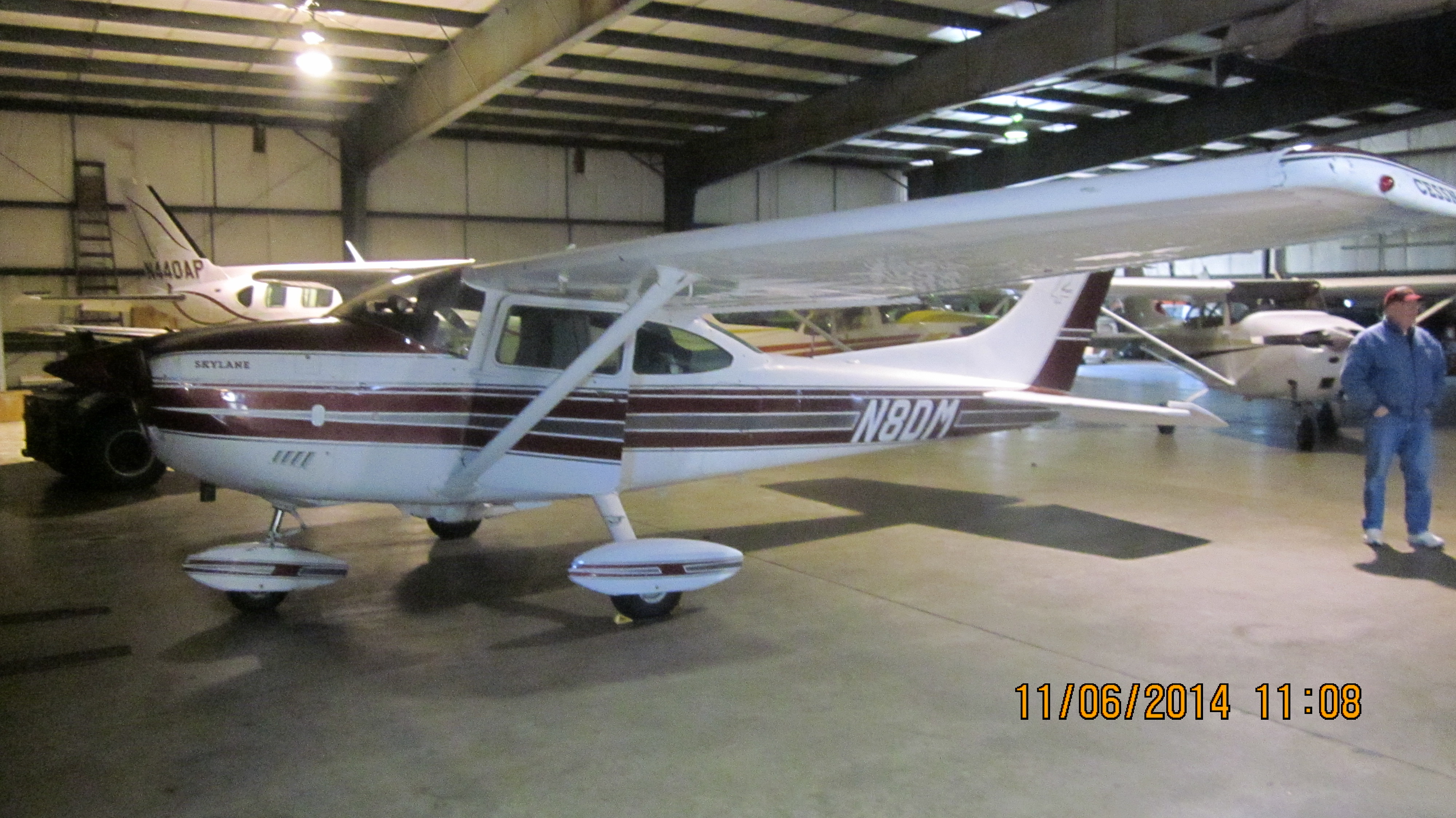 C182 N8DM and Fred in the hangar at Boone Airport (KBNW), Boone, IA, 11/06/14. (12/20)