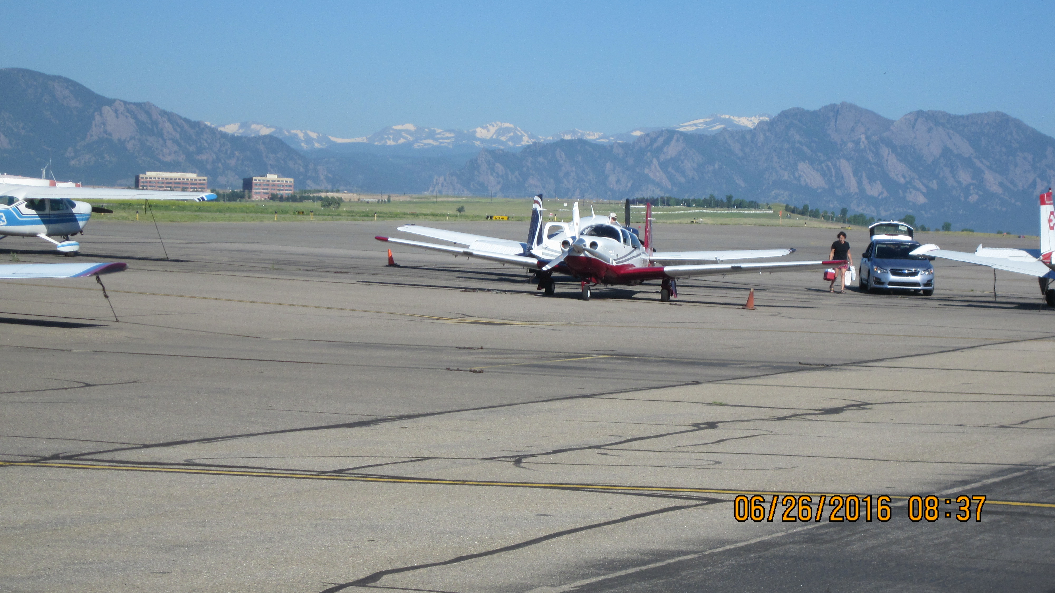 Kreg's Mooney is facing us, the other is loading. Looking W from metro Airport (KBJC) to the Continental Divide, 06/26/16 (01/51)