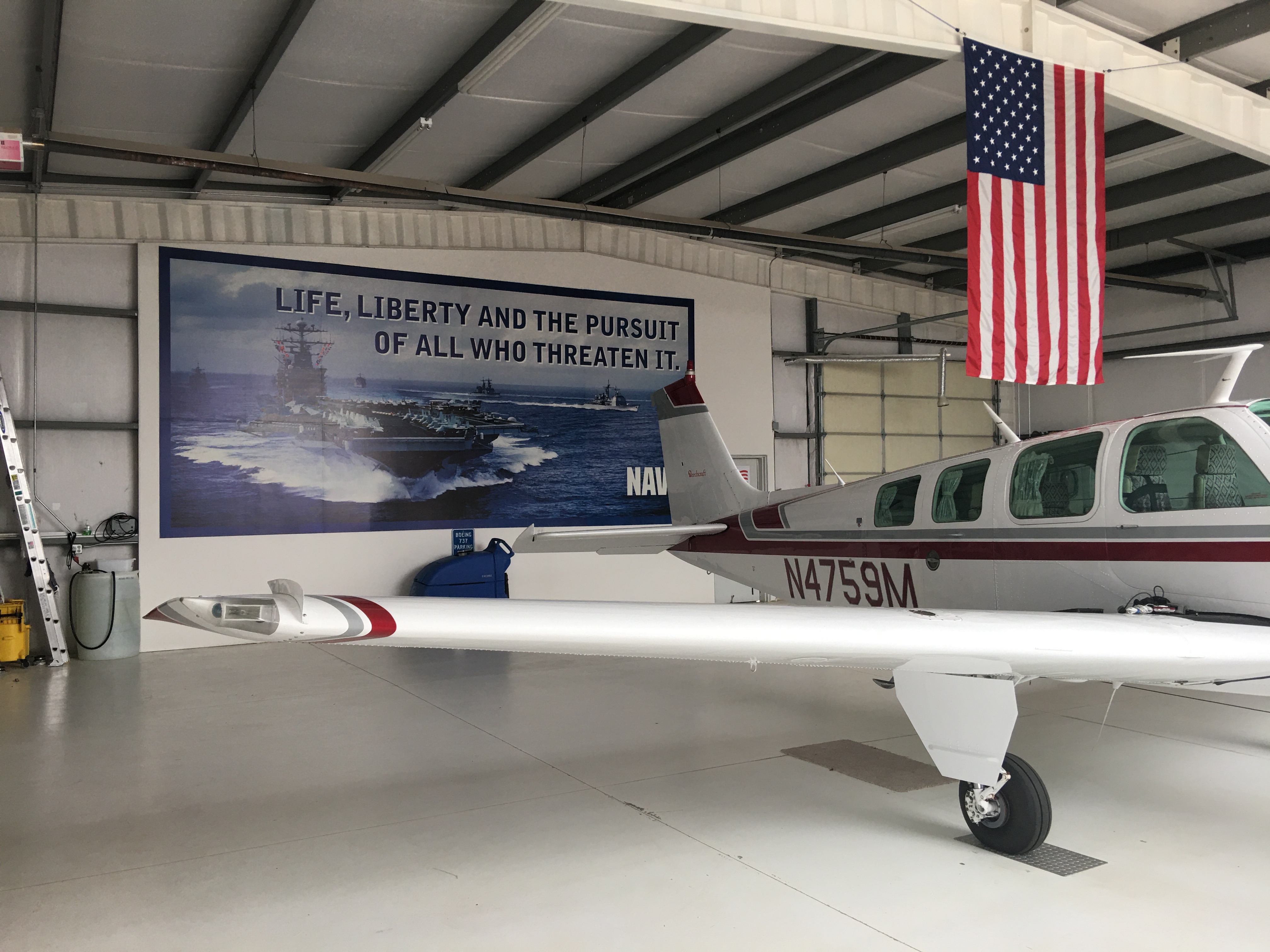 Bonanza N4759M in the hangar... see NAVY billboard "LIVE, LIBERTY AND THE PURSUIT OF ALL WHO THREATEN IT", 06/09/22 (124/206)